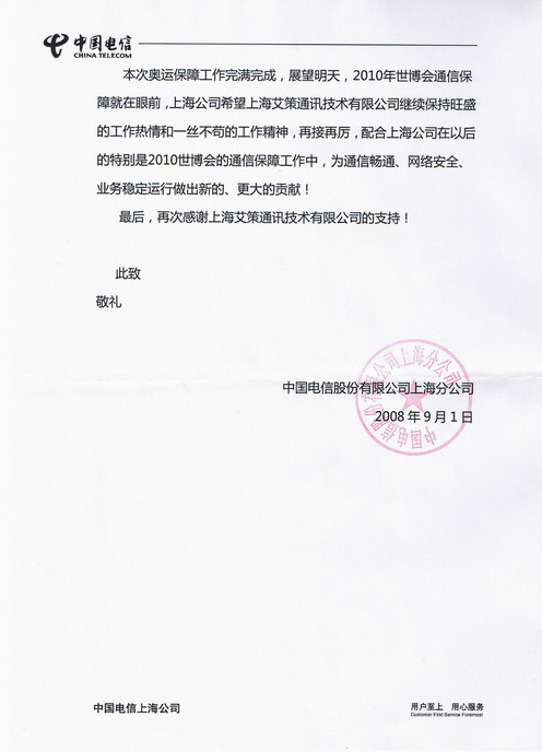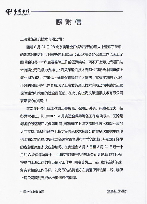 2008年9月26日,中國上海,艾策通訊。隨著2008北京奧運會的結(jié)束,各奧運城市的通訊保障也拉下帷幕。為了感謝我司在中國電信上海公司在奧運通訊保障期間所做出的貢獻(xiàn),日前,上海電信書面函件致謝我司。